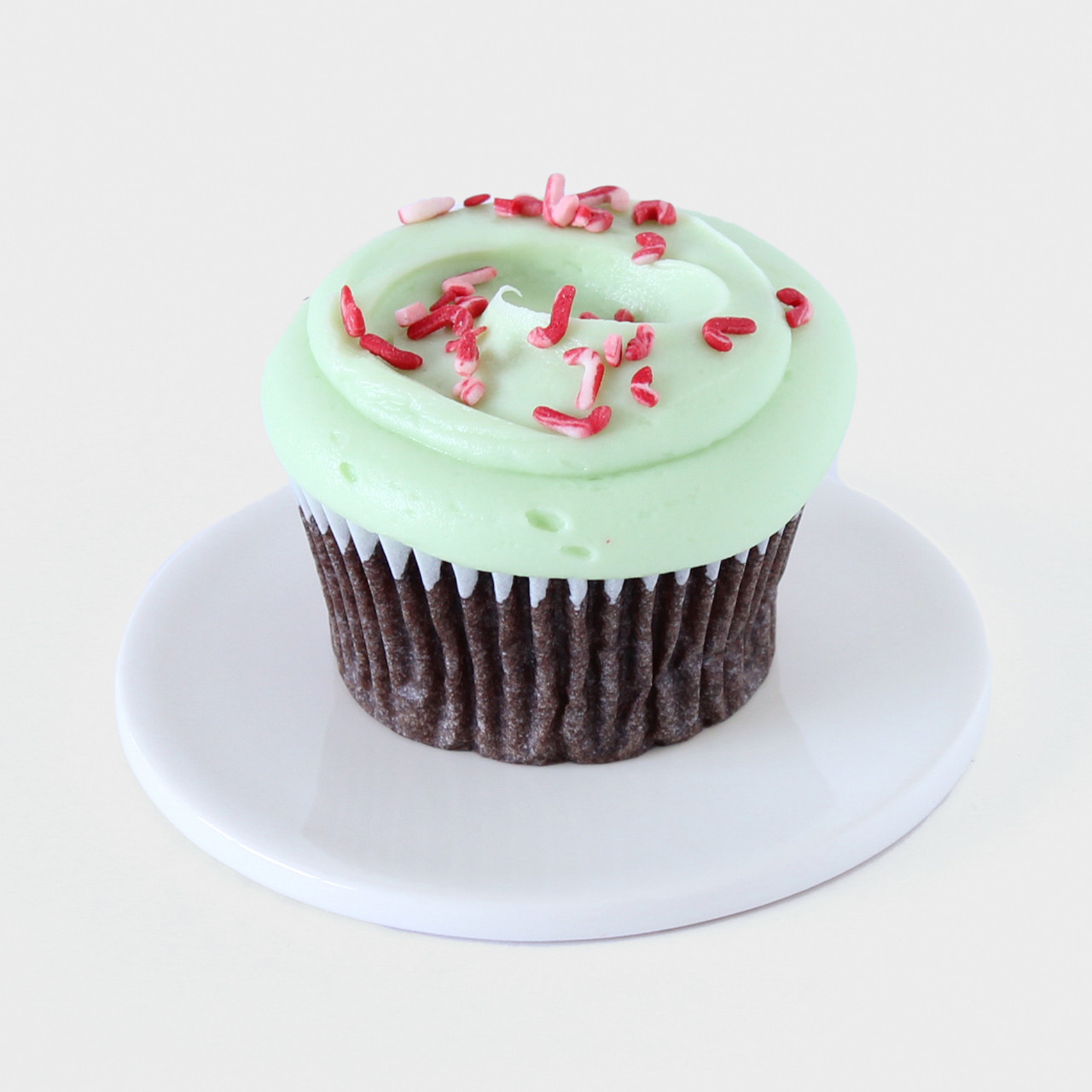 Moist chocolate cake frosted with mint buttercream and sprinkled with mini candy cane pieces — $4.99 each (sold online in boxes of 4, 8, or 12—mix & match flavors!)