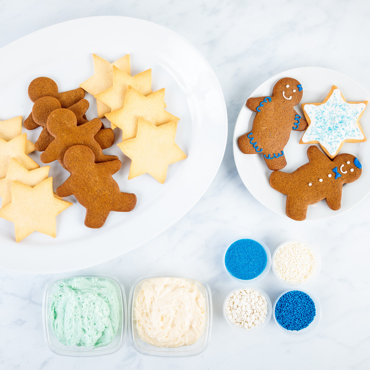 A dozen assorted cookies (8 star cookies and 4 gingerbread) for you and your family to decorate. Includes blue and white vanilla buttercream, holiday sprinkles, and sanding sugar. — $71.40