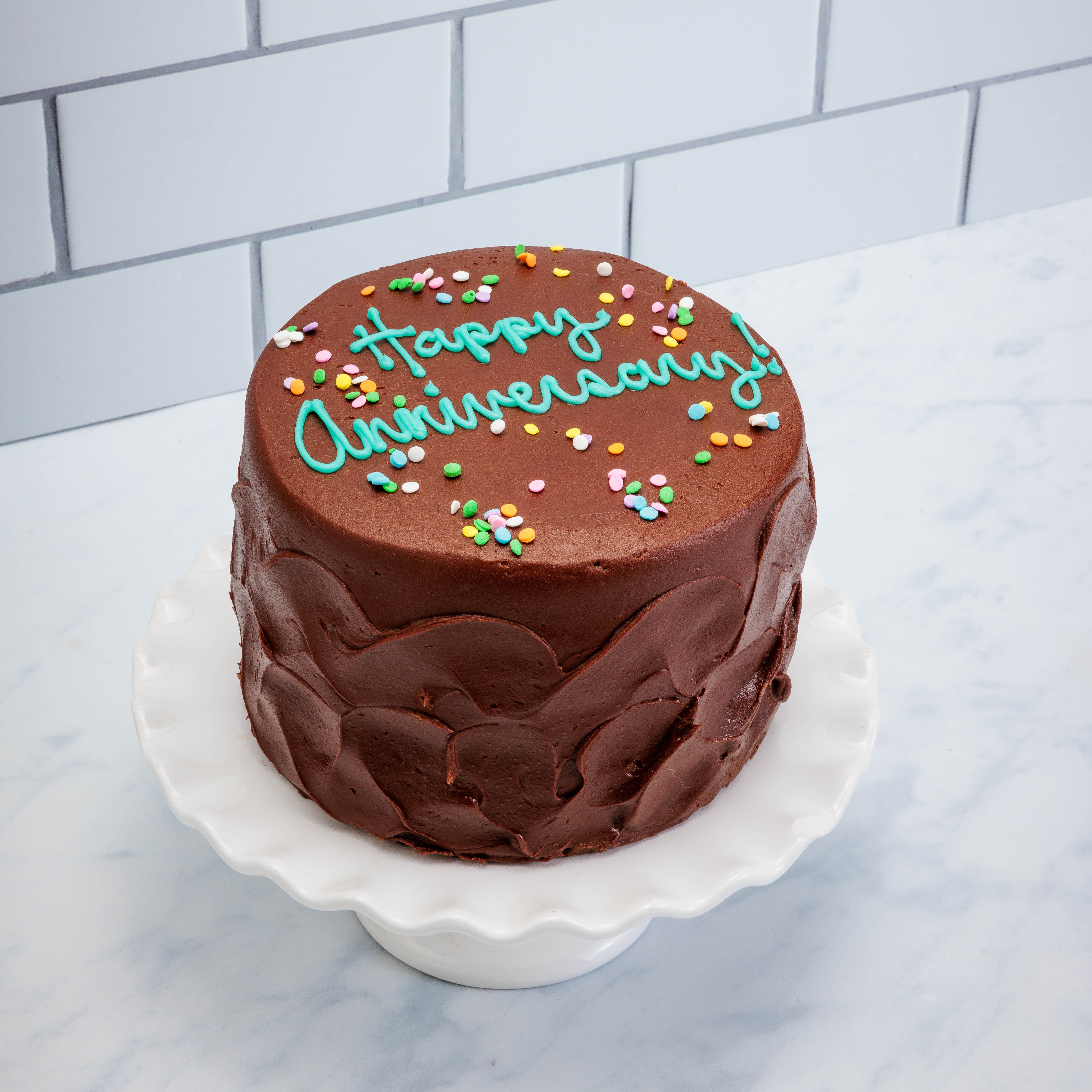 “Just like you remember!” 4-layers of moist chocolate cake filled and covered in rich, dark chocolate buttercream frosting. This cake is a 6-inch cake. Serves 6-12 people. Also comes with a complimentary candle and matchbox!