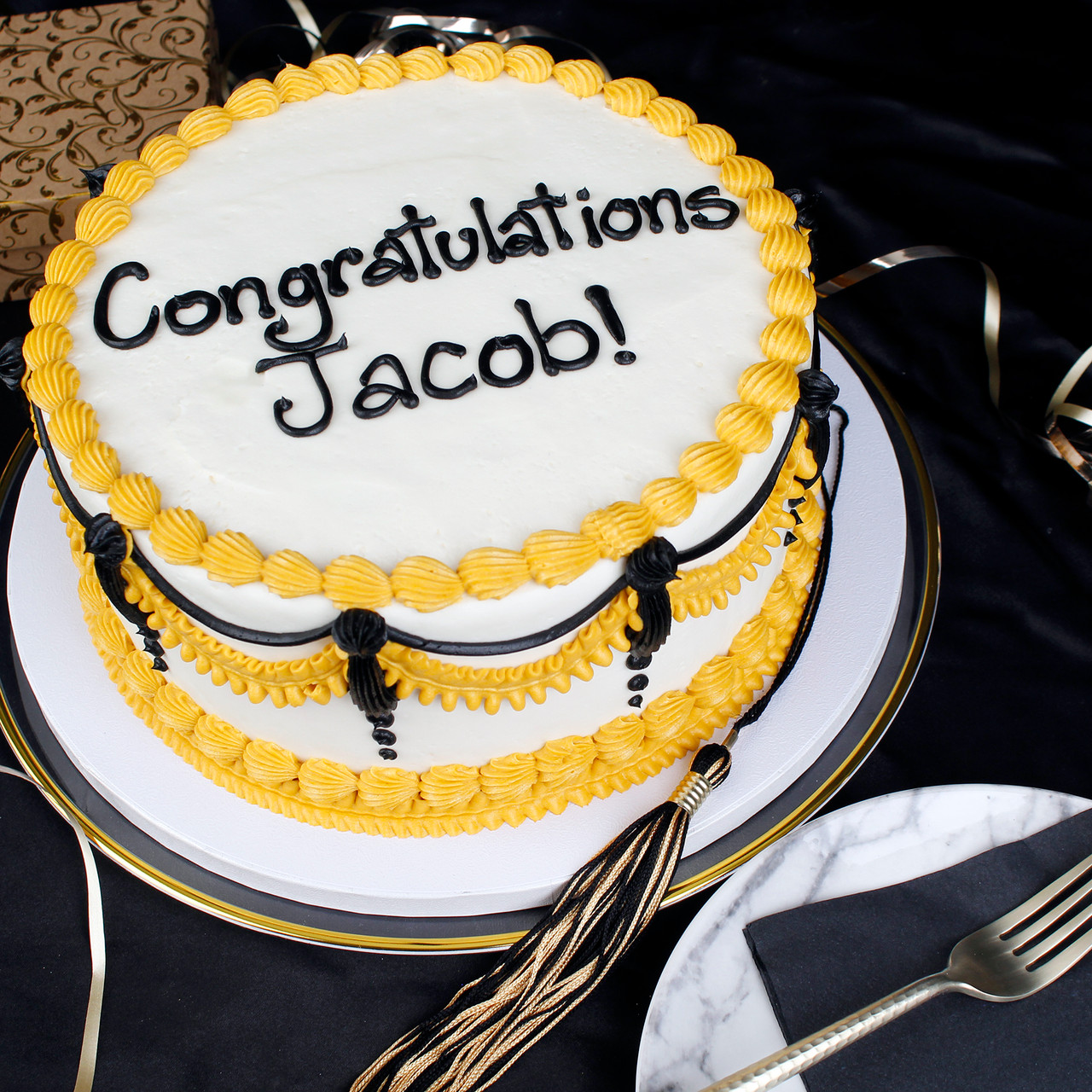 Congratulate your grad with this vintage school cake made with white vanilla buttercream. Add a custom inscription or choose from select school logos you can find HERE.