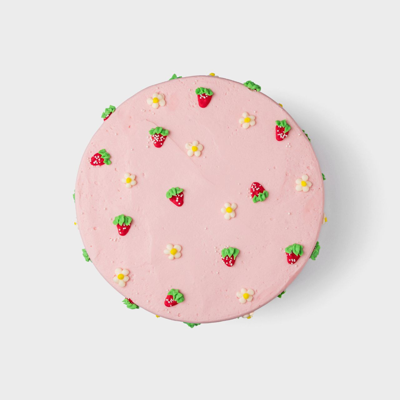 Inspired by sun-soaked afternoons and sweet summer cravings, our Strawberry Fields Cake is a little moment of joy in dessert form. Soft pink frosting is decorated with tiny hand-piped strawberries and cheerful daisies. Simple, nostalgic, and perfect for celebrating just about anything.