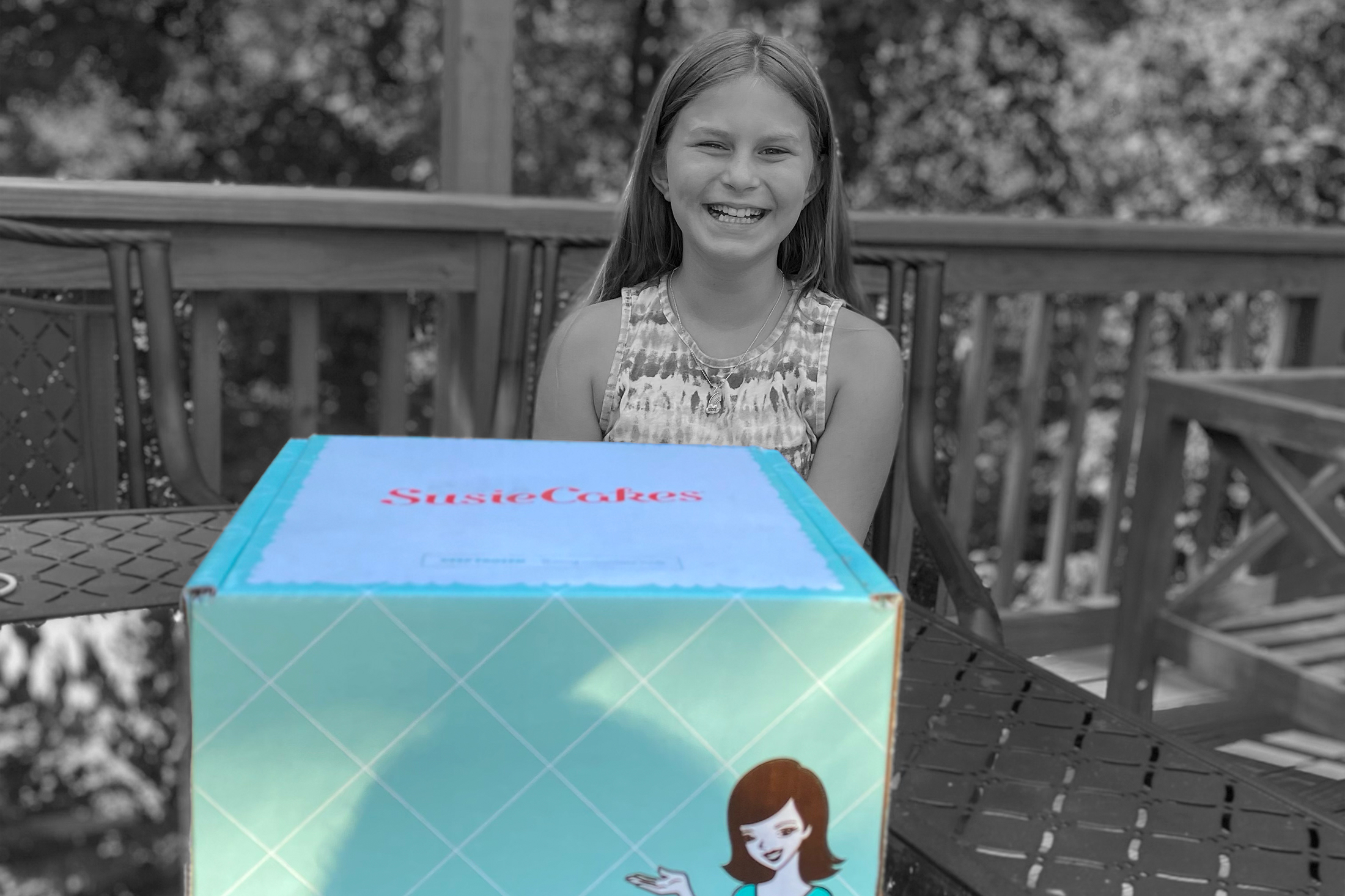 Our Vanilla Celebration Cake is filled and frosted with signature retro SusieBlue vanilla buttercream