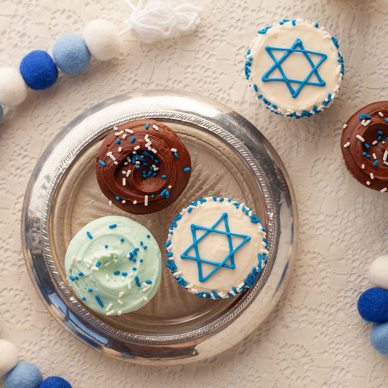 Vanilla, Chocolate & Red Velvet cupcakes topped with festive sprinkles and two cupcakes will have the Star of David. - $23.96 Baking through 12/22