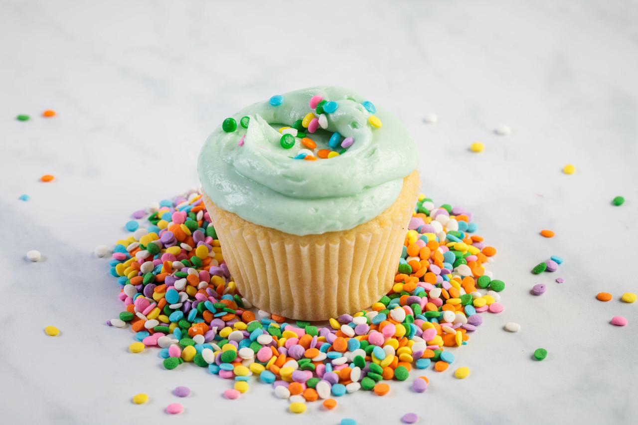 Vanilla cupcake topped with our signature retro blue vanilla buttercream — $4.99 each (sold online in boxes of 4, 8, or 12—mix & match flavors!)
