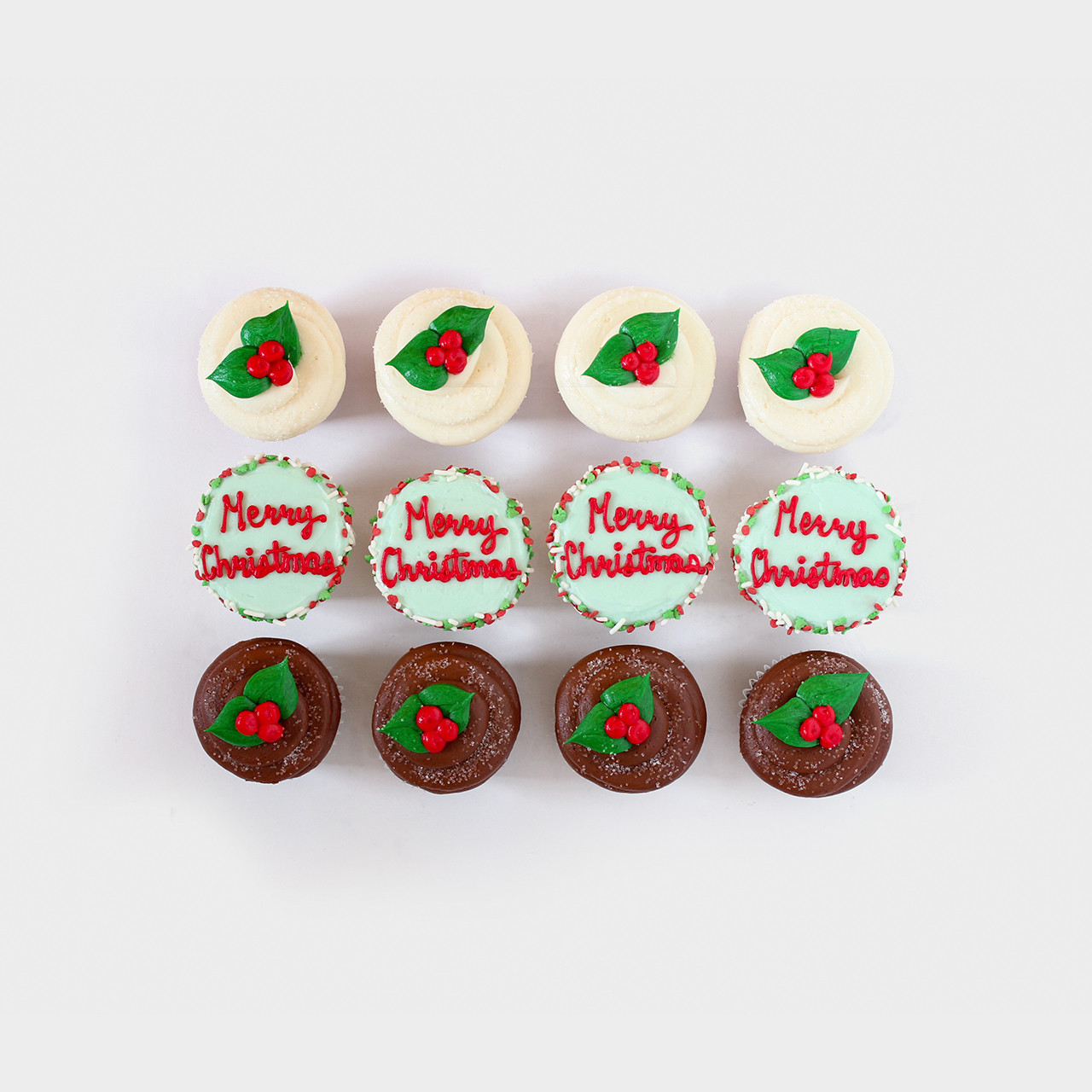 Four Red Velvet with a holly decoration, four Vanilla with SusieBlue buttercream and a "Merry Christmas" message, four chocolate cupcakes with chocolate buttercream and a holly decoration. Chocolate & Red Velvet cupcakes topped with sanding sugar. — $71.88 (dozen)