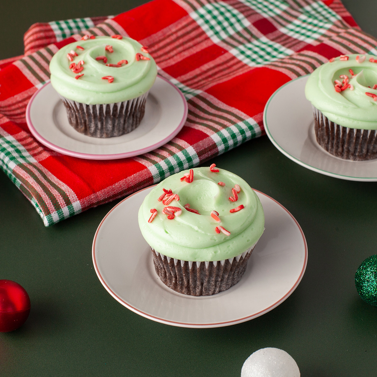 Moist chocolate cake frosted with mint buttercream and sprinkled with mini candy cane pieces — $4.99 each (sold online in boxes of 4, 8, or 12—mix & match flavors!)