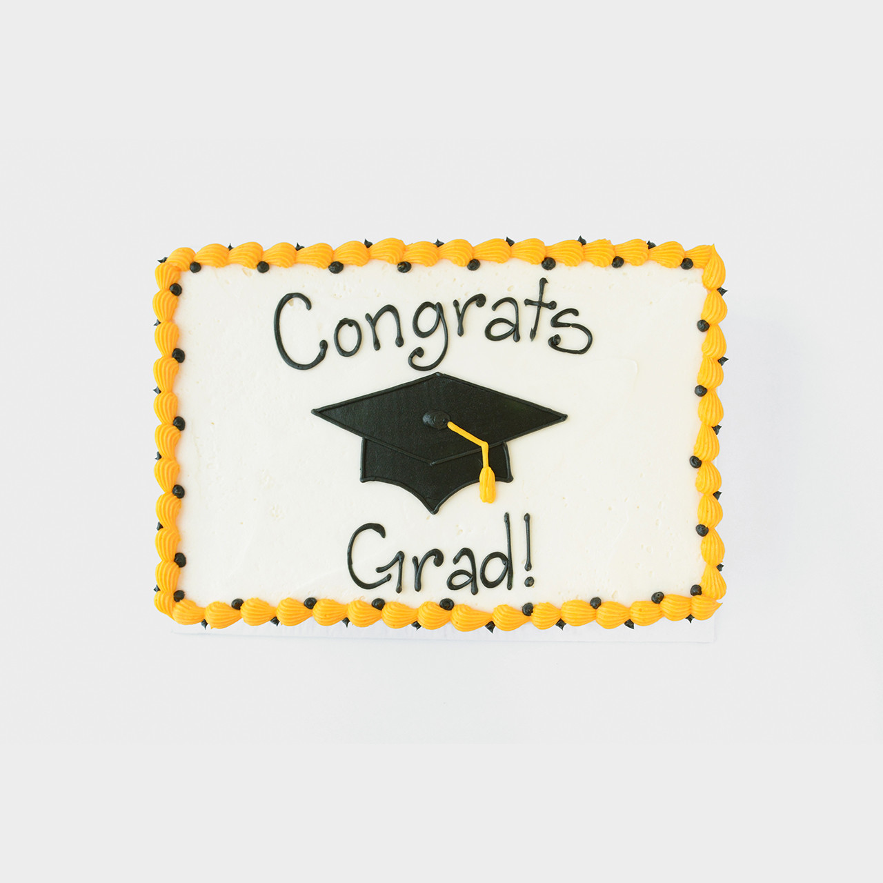 Congratulate the 2025 graduate with this fun Congrats Grad cake made with white vanilla buttercream. Customize by changing the inscription color, border color and tassel. 48hr notice required. 72hr notice if ordering from our San Francisco bakeries. — $205