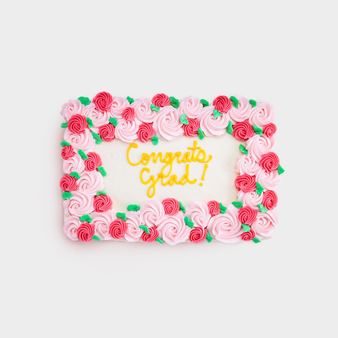 Quarter Sheet Cake with pink buttercream rosette decoration & your customized inscription. Perfect for the 2025 grad, a birthday celebration and more! 48-hr notice required. 72hr notice if ordering from our San Francisco bakeries.