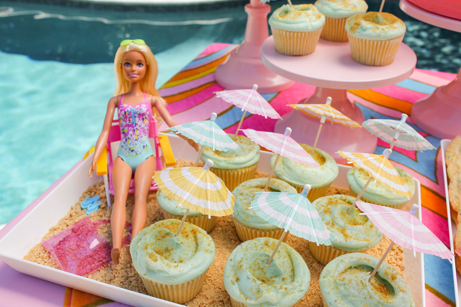 Utilize various levels of dessert stands to add depth and visual interest. Arrange the desserts in an eye-catching manner, placing taller items towards the back and shorter treats towards the front. Fill empty spaces with beachy accessories and of course, barbies!
