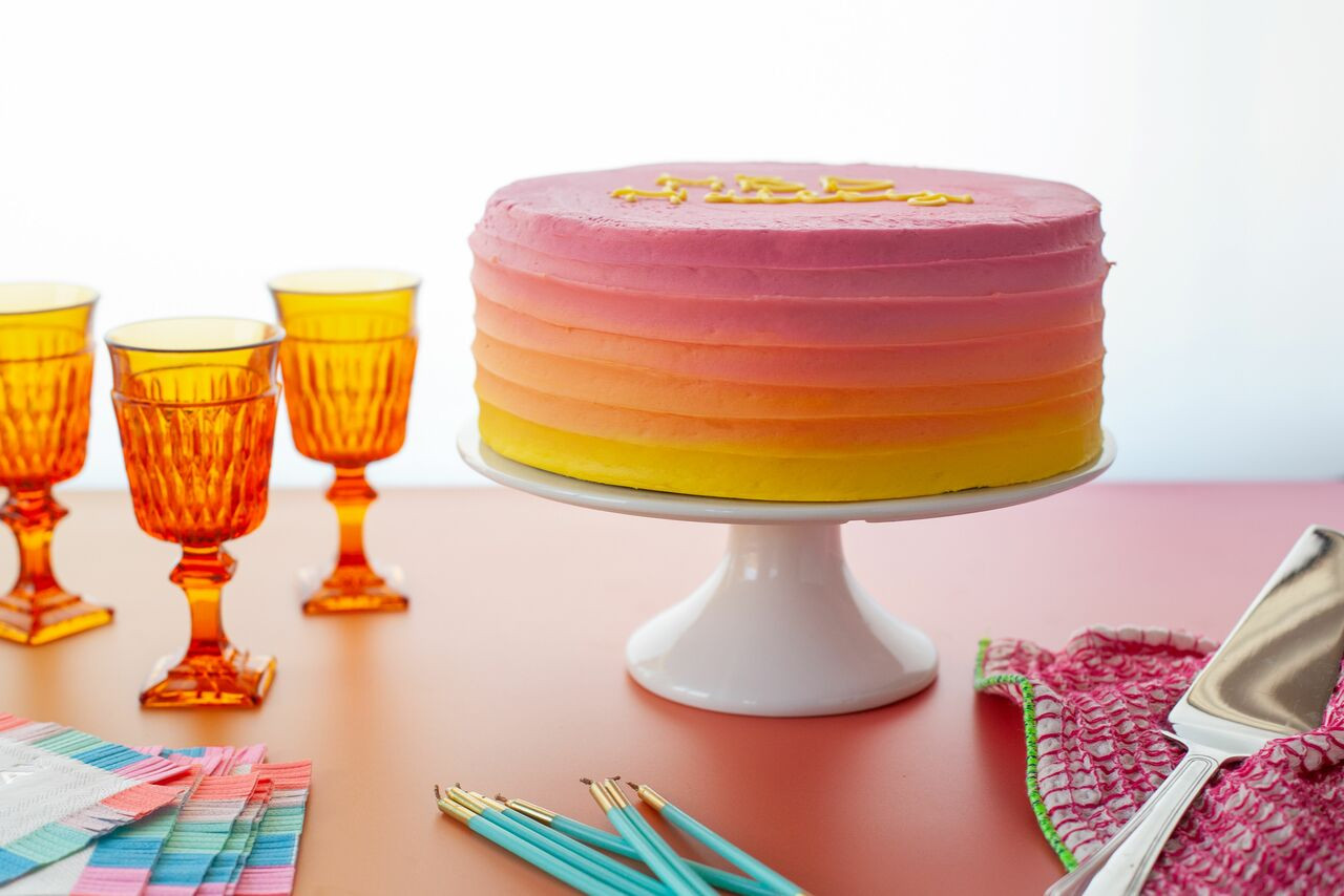 Transform your celebrations with our stunning Sunset Ombre Cake! This eye-catching cake features several shades of pink, yellow, and orange buttercream, creating a fun ombre design that beautifully resembles a sunset.